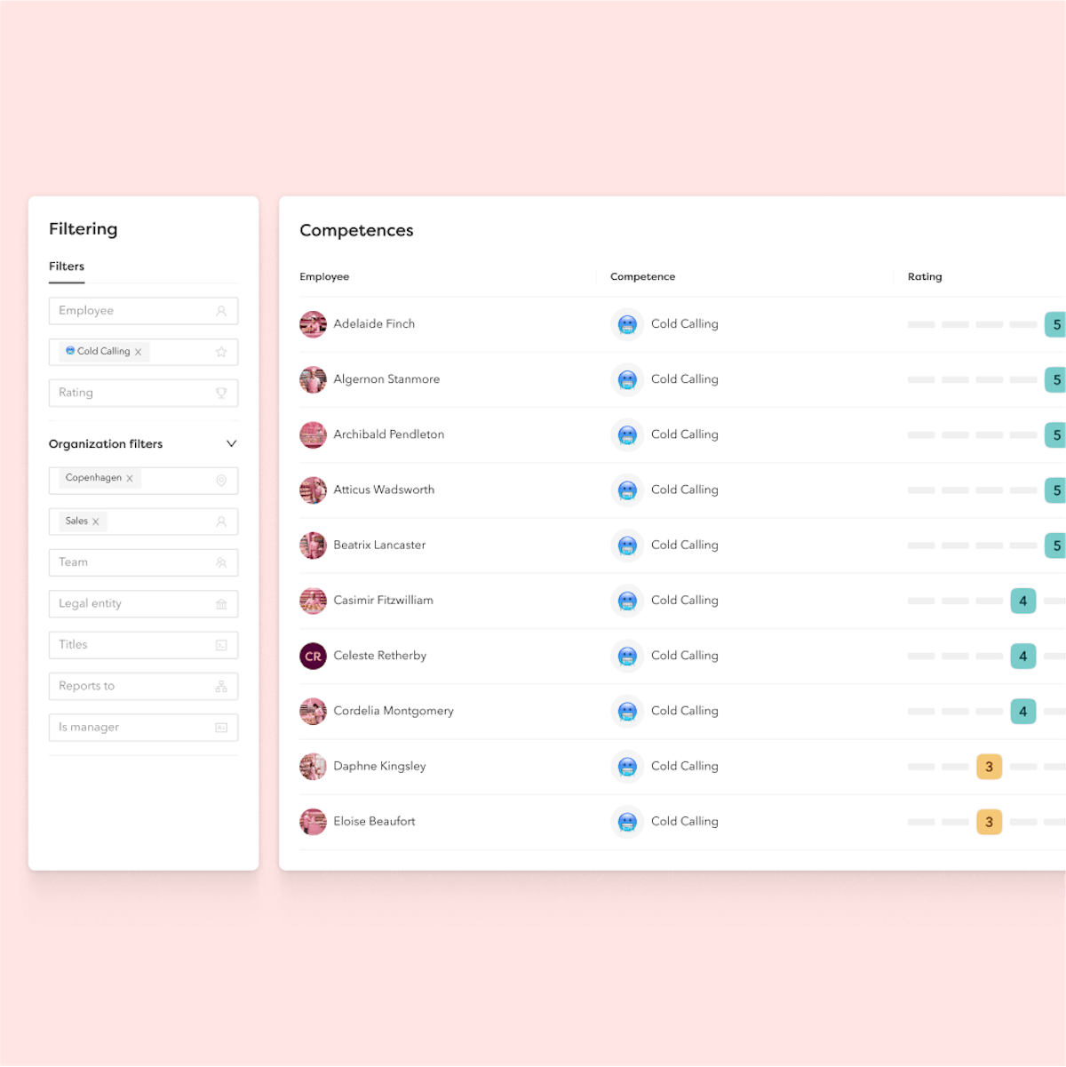 See all competences in a single view, with filters to help you spot any gaps.