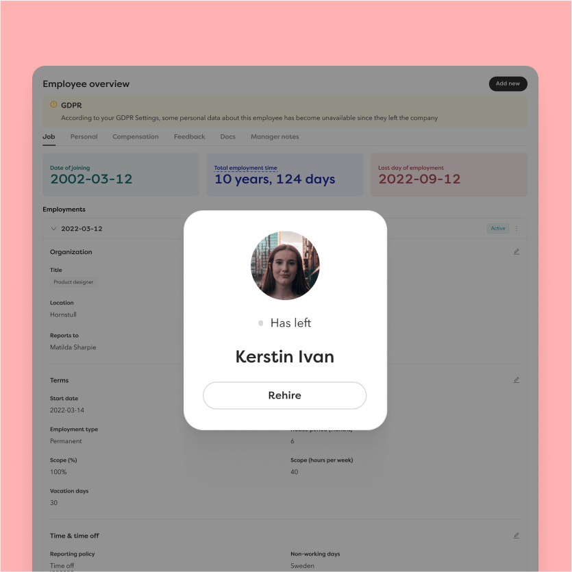If you later wish to rehire the employee, you can easily reactivate the existing profile and update it with new information. At the same time, the history is preserved in one place, providing a clear and consolidated overview.