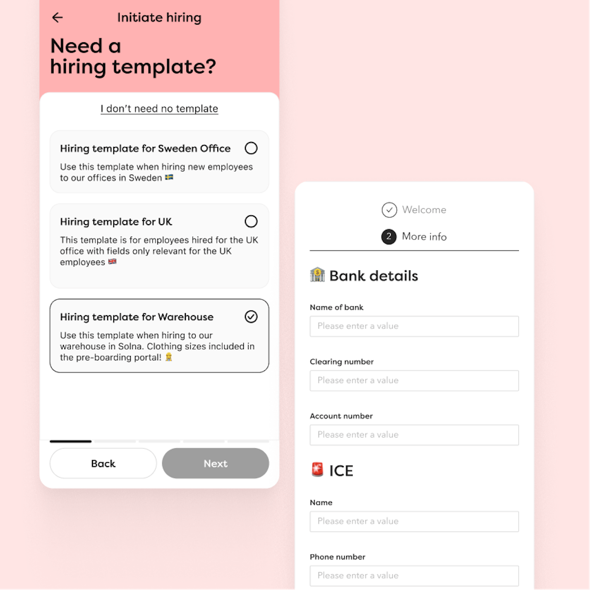 Make the pre-boarding process simple and seamless, for both you and the candidate. With tailored templates, you get a consistent process that adapts effortlessly to different organisational units. Give your managers the right conditions to drive hiring independently!