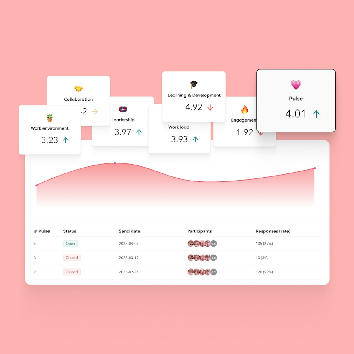 Results are continuously updated, displaying a rolling trend line along with real-time data. You can track overall engagement or zoom in on specific areas by filtering by department, team, or manager. This helps you identify patterns and take action where it matters most.