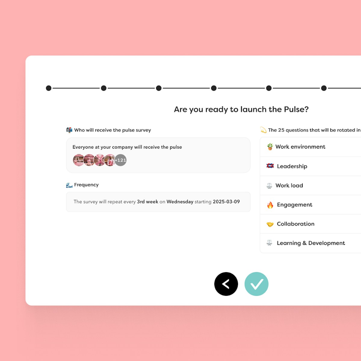 Creating a pulse survey in Hailey is easy. A guided setup helps you define the recipients, whether it's the whole company or specific teams. You can also choose how often surveys should be sent for an automated pulse frequency.